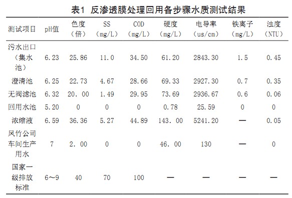 1.2.2 反渗透膜处理回用各步骤水质测试 连续一周取各步骤水样测试水质,测试结果的平均值见表1。