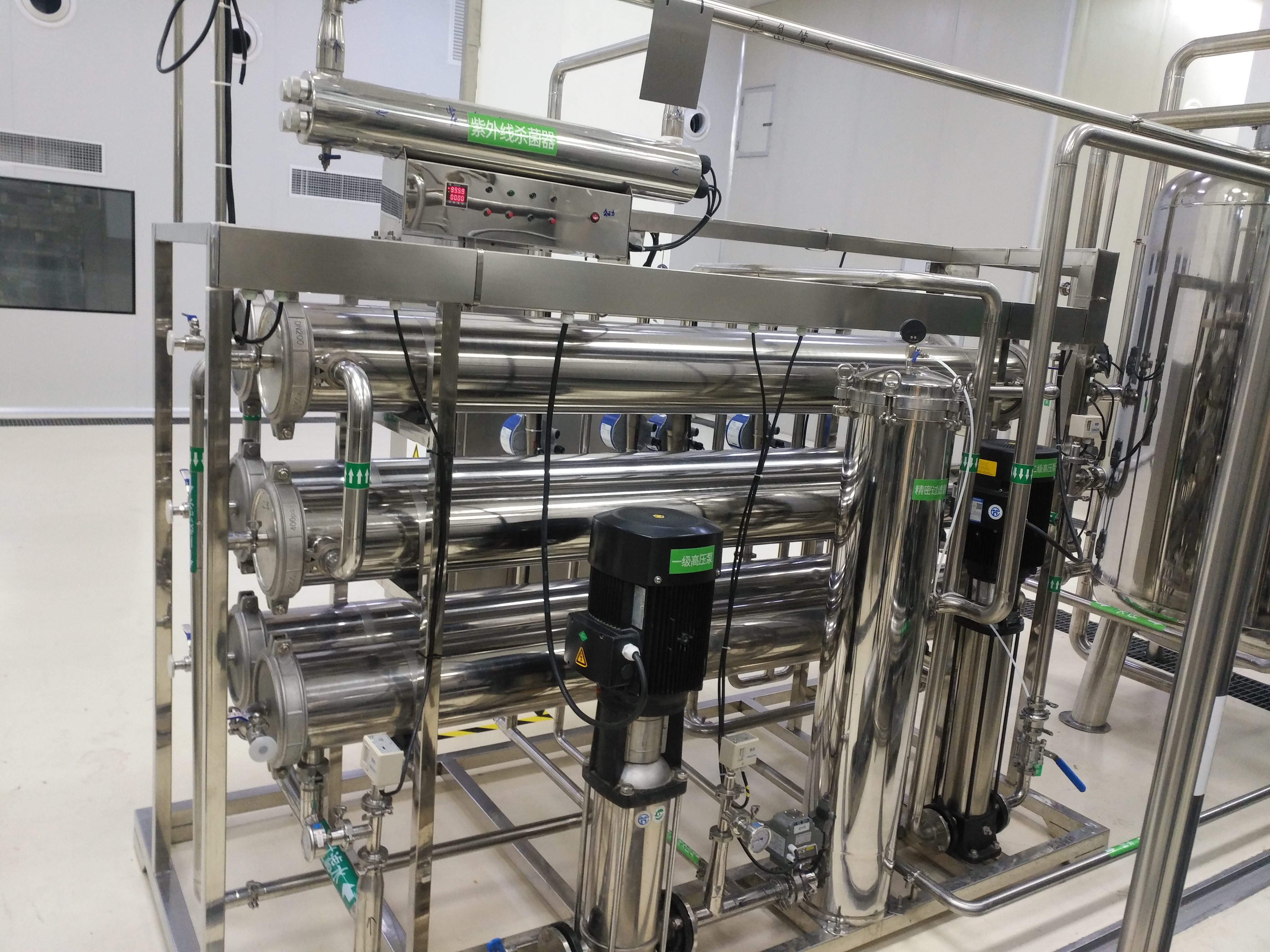 原水进水为甲方提供的软化水,采用的工艺为:多介质过滤器—高压泵—反渗透——出水+紫外线杀菌工艺。