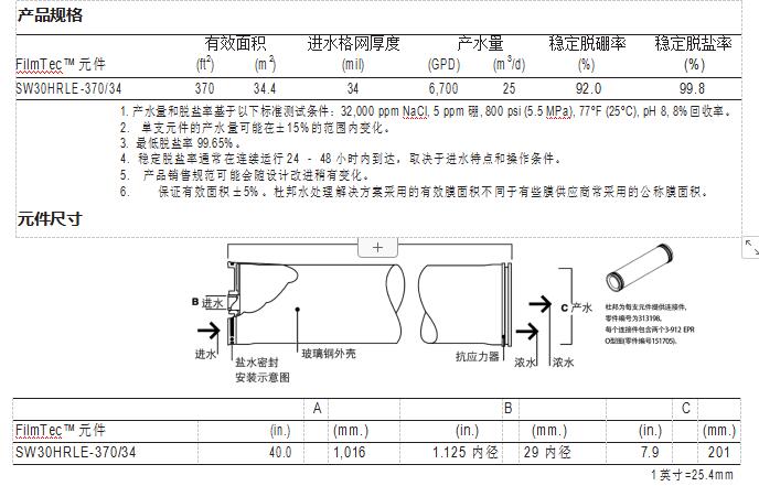 FilmTec™ SW30HRLE-370/34 元件是一款高耐久性、高脱除率、高产水量海水膜元件, 用于高污染或挑战性水源的情况,有助于系统的稳定运行和产水成本的降低。