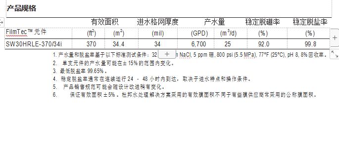 FilmTec™ SW30HRLE-370/34i 元件是一款高耐久性、高脱除率、高产水量海水膜元 件,用于高污染或挑战性水源的情况,有助于系统的稳定运行和产水成本的降低。
