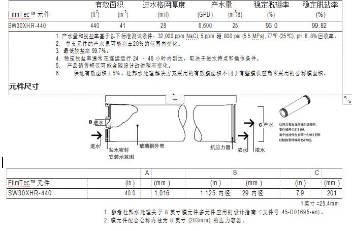 在 FilmTec™ 产品系列里,SW30XHR-440 元件是脱盐率最高的海水反渗透膜元件, 多数情况下,采用一级海水反渗透系统就可达到严格的水质要求。此外,最高 有效膜面积和较宽进水格网的组合,能够提高生产率,降低清洗频率,从而实 现可持续的较低的运行周期成本。FilmTec™ SW30XHR-440 元件有以下优点 :