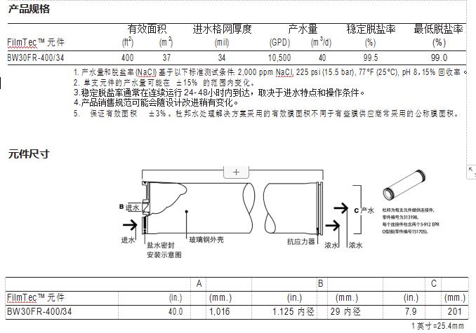 FilmTec™ BW30FR-400/34 是一款适用于处理高污染水源、同时 具有抗污染性、高脱盐率和高产水量的抗污染膜元件。
