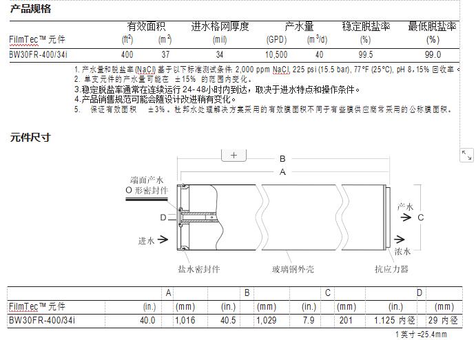 FilmTec™ BW30FR-400/34i 是一款适用于处理高污染水源、同时 具有抗污染性、高脱盐率和高产水量的抗污染膜元件。