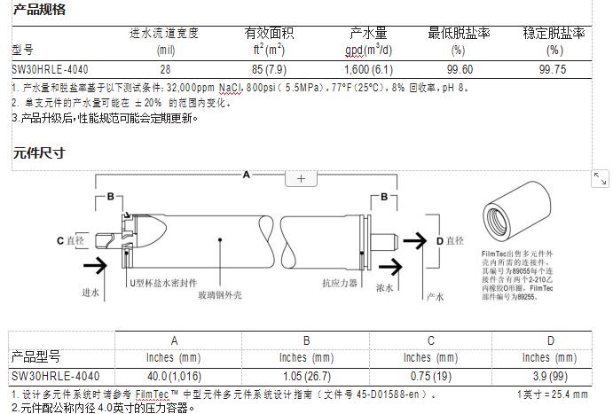FilmTec™ SW30HRLE-4040 反渗透膜元件是 SW30HRLE-400 膜元件对应的 4 英寸产 品。SW30HRLE-400 是业界领先的海水淡化膜元件,同时具有前所未有的高产水 率和脱盐率,使得净化高盐度水的系统制水总成本最低。