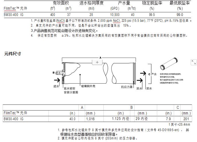 FilmTec™ BW30-400 在要求高品质的产水时是很好的产品选择。这是市场上第一 款 400 平方英尺的膜元件,继续被广泛用于新设备和旧系统改造,尤其系统资 金和生产力是考虑因素时。BW30-400 IG 保持了与 BW30-400 膜元件相同的流量 和脱盐性能,只不过它不具备 ANSI 标准 61 认证或是 KIWA 认证,从而为工业级 的应用提供了更具成本效益的选择。