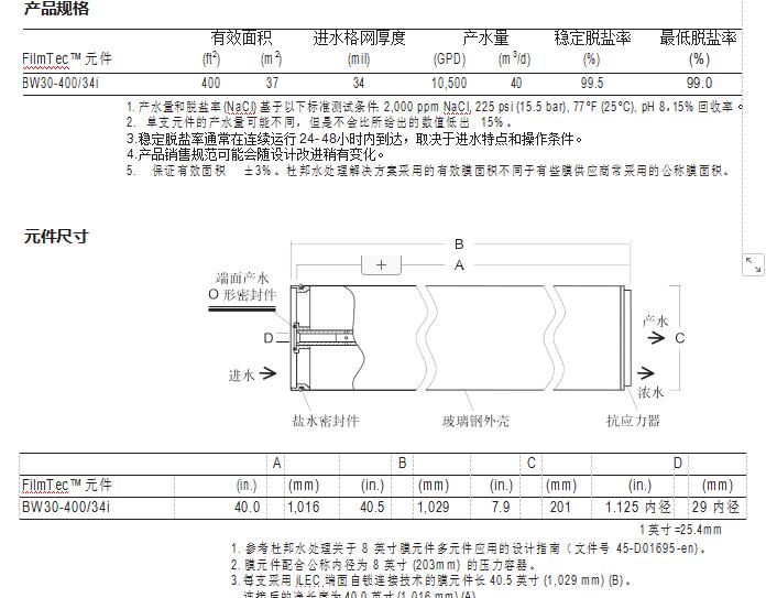 FilmTec™ BW30-400/34i 元件经证明,具有优异的性能: