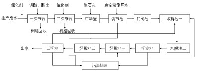酚醛树脂生产过程中产生的高浓度含酚废水的处理看似简单,实际具有一定的复杂性。由于废水中除了含有高浓度的酚外,还含有大量的小分子酚醛树脂及甲醛等其它物质。由于苯酚和甲醛是微生物的主要抑制物,因此应首先通过缩合手段将其除去,以提高废水的可生化性,比较后再采用生化处理使其达标入管网。废水处理工艺流程如图1所示。