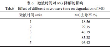 微波辐射时间对MG 降解率的影响如表6 所示。由表6 可知,随着微波辐射时间的延长,孔雀石绿的降解率逐渐增加,足够的微波辐射时间,对孔雀石绿在微波诱导下发生催化降解反应特别重要,较长的微波辐射时间与较高的孔雀石绿对应。当微波辐射时间为5 min 时,孔雀石绿降解率达到96.42%。
