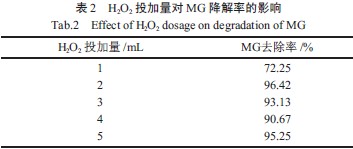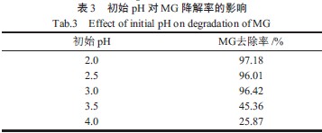 初始pH 对MG 降解效果的影响如表3 所示。由表3 可知,pH 在2.0~3.0 时脱色效果较好。当pH较高时,羟基自由基的产生受到了抑制,同时Fe3+ 还会以氢氧化物的形式沉淀,使催化活性降低。另外,H2O2在碱性条件下会发生无效分解,导致H2O2的利用率降低,使得反应不能顺利进行,从而脱色率降低。故孔雀石绿初始pH 定为3.0。
