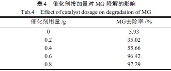 催化剂Fe2O3/γ-Al2O3投加量对MG 降解率的影响如表4 所示。由表4 可知,没有催化剂存在时孔雀石绿降解率很低,仅为5.93%,尽管H2O2在微波辐射下会产生·OH,但该途径发挥的作用十分有限,随着催化剂的加入,孔雀石绿的降解率迅速增加,说明催化剂的作用在孔雀石绿降解中作用显著;随着催化剂的继续增加,孔雀石绿的降解率变化趋于平缓。当催化剂投加量为0.6 g时孔雀石绿降解率达到96.42%。