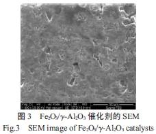 分析催化剂EDS 结果可知,催化剂表面主要是由氧、铝、铁3 种元素构成,因此可以得到催化剂为Fe2O3/γ-Al2O3催化剂。Fe2O3/γ-Al2O3催化剂的SEM如图3 所示,由图3 可知,催化剂表面的Fe2O3晶体颗粒较小,且分布均匀。这是因为超声辐射主要源于声空化机制,空化过程中产生的局部高压和高温可使液体中产生强大的冲击波或高速射流,并以特殊能量形式加速了溶液中Fe3+ 在γ-Al2O3表面的吸附平衡,同时可以更高效地利用载体的比表面,使金属离子在相同的载体上达到比较大量吸附平衡,从而提高了Fe3+ 在γ-Al2O3上的负载含量,增强催化剂的催化活性。