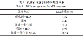 由表1 可知,催化剂+H2O2、微波、微波+ 催化剂、微波+ H2O2体系对孔雀石绿去除率很低,反应5min 后去除率比较高仅达到5.93%。微波+ 催化剂+H2O2体系使孔雀石绿降解达到了很好的效果,处理5 min 后,孔雀石绿降解率达到96.42%。