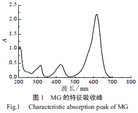 配置质量浓度30.00 mg/L 的孔雀石绿溶液,吸光度用NE-300 紫外- 可见分光光度仪对其在200~800 nm 扫描,测出其比较大吸收波长为616 nm(见图1),本文中所有吸光度数据均用去离子水为参比;孔雀石绿染料pH 采用pHs-3c 型精密酸度计测定。