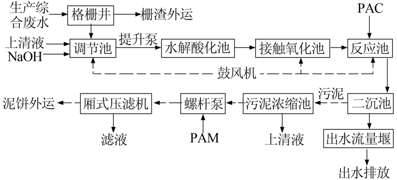 生产废水中含有的较大药渣、漂浮物颗粒经过前置的格栅拦截后得到有效去除,废水经格栅井后自流入调节池进行初步的匀质、匀量,同时在调节池内由计量泵添加一定浓度的碱液,将废水的pH由初始的4.0~6.0调整为7.0~9.0;在调节pH的同时需利用罗茨鼓风机往池内曝气,主要是因为在调节池内对废水进行预曝气及搅拌可以尽可能地避免大量SS在调节池内堆积和发酵,同时还能够将废水中的低分子有机污染物吹脱氧化。随后由潜污泵提升至水解酸化池。在水解酸化池中得到驯化、培养的大量厌氧微生物,则直接将废水中所含的大部分高分子有机污染物破碎降解为小分子有机污染物,进而提高废水的可生化性,有效地缓解后续好氧生化处理工序的处理压力。废水经水解酸化处理后自流进入接触氧化池,接触氧化池中的好氧微生物种群及硝化菌菌群在池内罗茨鼓风机曝气充氧的情况下,大量的有机污染物被好氧微生物种群氧化降解为CO2和H2O,废水中的氨氮则被氧化为硝酸盐和亚硝酸盐得以去除。经接触氧化池处理后的出水还需通过外加聚合氯化铝(PAC)进行比较终的混凝沉淀反应,作用是使废水中不易沉淀的细小颗粒絮体凝聚形成大颗粒絮体,混合液随后进入二沉池内进行固液分离,保证比较终出水水质稳定达到排放标准要求。固液分离后的上清液溢流进入出水流量堰可达标排放,剩余污泥则排入污泥浓缩池进行污泥浓缩处理。