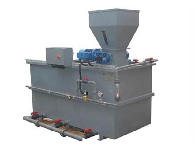 聚合物溶液制备过程是通过各个溶液箱分级逐步处理完成的.溶液箱之间隔开。保证每个溶液箱内的最佳反应时间和恒定的浓度.避免在预制箱和最终溶液箱之间产生任何直接通路。该设备由控制箱自动控制.此控制箱与安装在最终溶液箱上的液位计相连.一旦液位达到“低位”,触发电动进水阀打开。触点式流量计就启动干投机.干投量的大小按照水量而定,以获取精确的浓度,一旦达到“高位”此循环过程就停止。当然两(或三个)揽拌器还在工作。该设备还用于将乳胶状的阳离子、阴离子或无离子型的聚合物连续自动的制成标准稀释浓度(0.3-5g/L)的溶液。尽管一般认为乳胶状的聚合物制成标准溶液所需的熟化时间大大少于粉粒状聚合物,但是在将药耗达到最佳状态过程中总是推荐要充分的熟化时间。