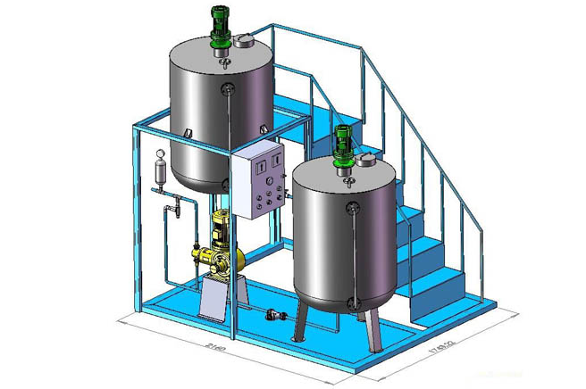 本装置主要包括药液溶配系统、计量投加系统、安全系统和控制系统等四部分。