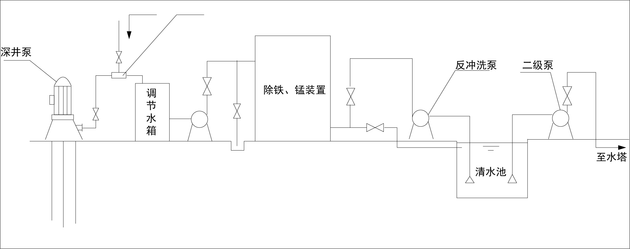 除铁锰装置由本体、引射曝气装置、中间加压泵、反冲泵、控制系统、供水泵及管网系统组成。