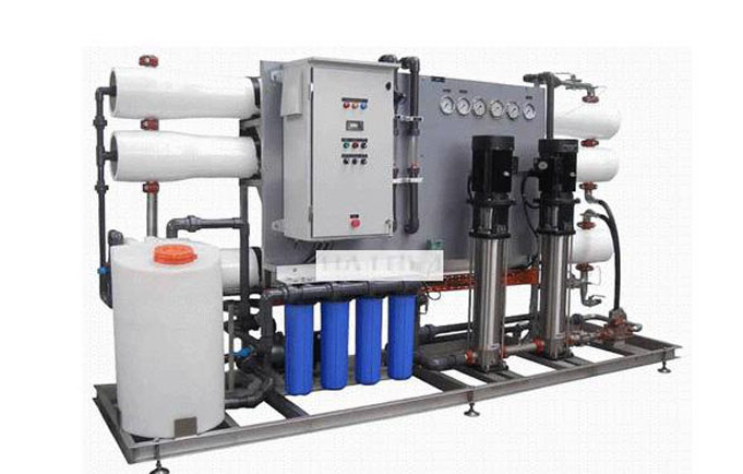 原水(设有压力保护)→增压泵(一用一备)→砂过滤器→炭过滤器→硬化器(根据地区不合选用)→紧密过滤器(或称保安过滤器)→两头水箱→RO前水泵→紧密过滤器(或称保安过滤器)→RO高压泵→RO反渗透零碎→RO水箱→RO水增压泵→混床→终端紧密过滤→设备用水(水质可以达到16MΩ.cm以上即0.06 μs/ ㎝以下,25 ℃)