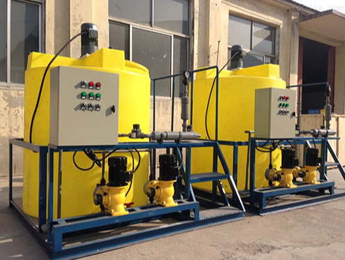 加药装置根据所需药剂浓度,在搅拌箱内配置,经搅拌器搅拌均匀后投入溶液箱、用计量泵向投药点或指定系统中输送所配制的溶液。成套加药装置具有结构紧凑、安全简单、操作使用简便等特点。加药装置还可根据用户不同工艺流程的要求,进行有针对性的设计、配置必要的部件,实现自动远程控制等功能。