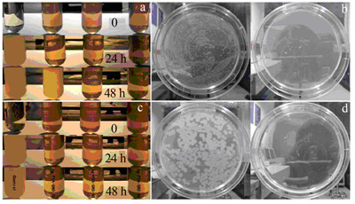 图 4 Ag-PDA-石墨烯复合粒子对E.coil (a,b)和B.subtilis (c,d)的抗菌效果