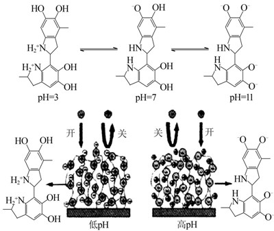 多巴胺(dopamine),一种生物神经递质。2007年,H. Lee等〔2〕从贻贝的黏附蛋白中获得启发,利用多巴胺研究了其在不同有机、无机材料表面的自聚涂覆功能,并成功形成了功能化的改性表面。自此,有关多巴胺在除神经学外的应用报道不断引起人们的关注。基于多巴胺的黏附性、还原性以及生物相容性,多巴胺及其衍生的复合粒子逐渐被用于各个领域,如抗菌〔3〕、催化〔4〕、生物传感器〔5〕、细胞成像〔6〕、膜技术、吸附等。尽管多巴胺具体的黏附机理还不是很清楚,但是科研人员普遍认为,这种性能与多巴胺所含有的邻苯二酚和氨基官能团有关。其中被广泛接受的解释有2种,一种是在不同的pH下,多巴胺自聚后所带电荷不同(见图 1)〔7〕,从而使得其所附着的材料表现出不同的功能;另一种是在水溶液中,多巴胺的邻苯二酚基团容易被氧化,生成含有邻苯二醌结构的醌化合物,多巴胺和其醌化合物发生反歧化反应,产生醌自由基,耦合形成交联键,从而在基体材料表面形成紧密附着的交联复合〔8〕。这与随后发现的多巴胺表现出还原性能〔9〕具有一致性。从多巴胺和氧化石墨烯的反应(见图 2)可直接观察到,混合了多巴胺的氧化石墨烯经过滤后,颜色变黑,说明氧化石墨烯被还原〔9〕。随着多巴胺在除神经学领域外应用的增多,需对其作用机理进行深入研究,从而使其得到更广泛的应用。