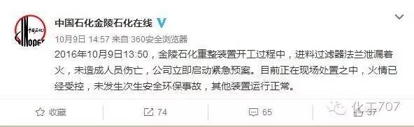 对此,中国石化集团金陵石油化工有限责任公司在其官方微博回应称,爆燃原因系重整装置开工过程中,进料过滤器法兰泄漏着火所致,但未造成人员伤亡,目前正在现场处置之中,火情业已受控,未发生次生安全环保事故,而其他装置则运行正常。