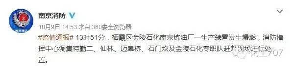 据江苏省南京市公安消防局官方微博称,10月9日13时51分,栖霞区金陵石化南京炼油厂一生产装置发生爆燃。南京电视台十八频道官方微博亦报道称:“网曝金陵石化炼油厂发生爆炸,尧化门上空黑烟笼罩”。