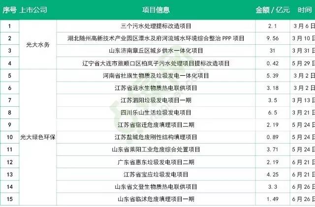 今年上市的光大绿色环保营收、毛利、盈利等整体增长近60%,新中标11个项目,而去年就上市的光大水务增长率约20~30%左右,新增的项目才6个。这其中的差别可能与国家政策利好的方向以及两家子公司的业务方式有关。