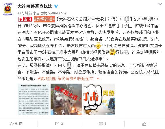 事故发生之后,网上流传的许多视频不实,有人以为是发生大爆炸,但大连警巡查执法微博公告称,此事故并未发生大爆炸事件。