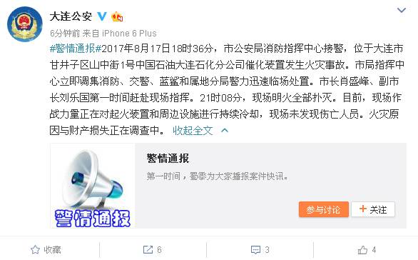 昨晚21:54,大连公安发布警情通报,证实中石油大连分公司发生火灾事故。