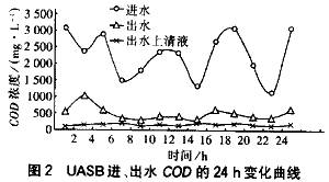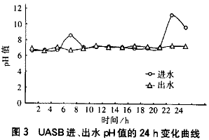 由于厂区占地有限,UASB之前未设调节池,进水COD浓度、pH值一天之内波动很大。在较强的冲击负荷下,UASB出水有时带出一些絮状污泥,使其COD增高,在一定程度上影响了出水水质,但从总的运行来看,UASB具有较强的抗废水冲击能力,处理效果稳定,出水COD(混合液)一般在500 mg/L左右,pH在7左右。2001年6月6日对UASB进行了24 h连续监测,所测数据包括进、出水COD浓度、pH值,其中出水COD分别测混合液和上清液两种水样。图2、3分别为UASB进、出水COD和pH值的24 h变化曲线。