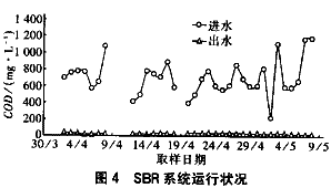 UASB正常运行后,厌氧出水和锅炉废水混合后的COD浓度比以前大大降低,但水质波动仍然很大(COD浓度在400~1 200 mg/L之间)。尽管如此,SBR的出水COD浓度始终保持在20~40 mg/L之间。从实际运行来看,该系统经过改造后,SBR反应池运行更加稳定,出水水质较好。图4为SBR反应池进、出水COD浓度的变化情况,整个系统监测结果见表4。