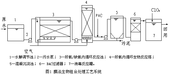 由于废水水质和水量波动大,不利于生物处理,因此生化处理前必须设水解调节池,确保生物后续处理作用稳定。由于排放的废水对一般好氧菌有明显的抑制性,COD去除效果差。因此,在曝气生化塔前设倒置的膜微孔曝气生物接触氧化A/O 反应池,确保有机物在生物组合反应器内得到较充分降解,去除大部分COD,同时提高废水的可生物降解性,为后续好氧生物处理创造有利条件。废水经倒置的膜微孔曝气生物接触氧化A/O工艺处理后,COD去除率高,可生化性提高,对后续好氧生物也无抑制作用,因此有利于进行后续好氧生物处理。在膜微孔曝气生化塔内充分曝气供氧的条件下,废水中剩余的有机物在好氧菌作用下充分利用水中溶解氧得到充分降解和去除,废水COD达回用要求。好氧生化塔处理后出水仍含有一定量的悬浮物、细菌和杂质,需再经过后续物化混凝和和活性炭过滤处理,通过生物絮凝和物化混凝协同作用,将水中的悬浮物杂质细菌和部分难降解有机物有效除去,使出水COD等指标达回用水质要求。