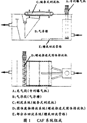 涡凹气浮(CAF)系统是世界独创的专利水处理设备,也是美国商务部和环保局的出口推荐技术。CAF是专门为去除工业和城市污水中的油脂、胶状物及固体悬浮物(SS)而设计的系统。整个气浮系统共由五部分组成,如图1所示:
