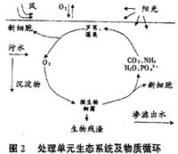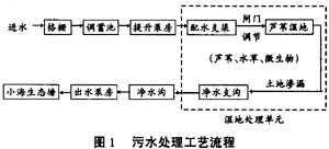 污水进入湿地处理单元——芦苇湿地系统,生活污水在周围筑有坝埂的芦苇湿地中,通过对配水闸门的调节,使其保持一定的深度,经过一定时间的培养,在每个单元内形成了一个相对独立的简单的生态系统,见图2。
