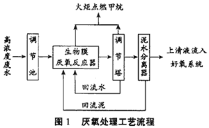 废水由反应器底部的8根布水管均匀进水,当废水流经生物膜悬浮性载体时,有机物得以厌氧降解,并连续不断产生沼气供火炬持续燃烧。在反应器内,微生物以固着形态生长,不易随水流失,泥龄长,产泥率较低,出水悬浮物少,几乎不用排泥。该反应器有效体积约为900m3,顶部有倒圆锥形的三相分离器,产生的沼气由顶部通气管直通火炬。