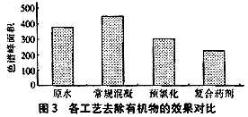 试验比较了PPC预处理工艺、常规工艺、预氯化加粉末活性炭工艺(以下简称Cl2+PAC工艺)的除有机污染物效能。