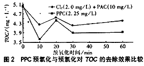 PPC预氧化与预氯化对TOC的去除效果见图2。