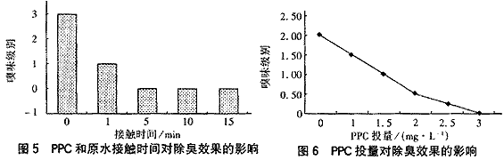 PPC投量及接触时间对嗅味去除效果的影响见图5、6。