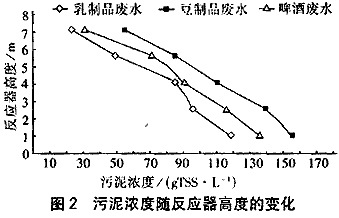 厌氧反应器中的污泥颗粒化程度较好,经2年运行后,从反应器各取样管取样测定污泥浓度的结果见图2。