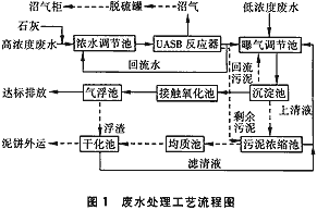 由车间排放的浓废水自流至浓水调节池,调节pH后由污水泵提升至UASB反应器,出水一部分回流至浓水调节池,它与UASB反应器形成集调节、厌氧降解为一体的处理系统;一部分自流至曝气调节池与淡废水混合,经曝气后由污水泵提升至沉淀池形成一级好氧系统;此时沉淀池出水已近达标,再自流至接触氧化池、气浮池进行好氧生化和物化处理(见图1)。?