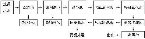 洗漂废水由于其成分复杂、可生化性较差,是较难处理的工业污水种类之一。早期大多采用简单物化沉淀或气浮,然后用活性污泥法来处理。随着人们对周围水体的环境质量要求越来越高,排放污染物的控制指标(如BOD、COD)越来越严,我公司采用成熟的“预处理-厌氧(酸化水解)-接触氧化-沉淀-消毒”综合处理的工艺。废水通过沉砂、筛网过滤预处理后进入调节池,生化处理采用“厌氧(酸化水解)—接触氧化”,利用微生物多级新陈代谢来降解和去除废水中的污染物。生化后的污水采用沉淀池进行泥水分离,上清液在消毒池中经强氧化剂消毒,达到杀菌的目的,使之达到排放标准。