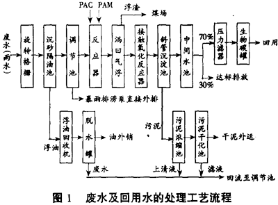 机械工厂废水中主要污染物是油,根据油在废水中存在形态的不同,分别采用不同的工序予以去除。废水及回用水的处理工艺流程见图1。