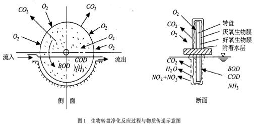 由电机、变速器和传动链条等组成的传动装置驱动转盘以较低的线速度在槽内转动,并交替地和空气与污水相接触。接触反应槽内充满污水,转盘经一段时间转动后,会在其上附着一层滋生着大量微生物的生物膜,微生物的种属逐渐稳定,微生物的新陈代谢功能也逐步地发挥出来并达到稳定的程度,污水中的有机污染物为生物膜所吸附降解。转盘转动离开污水与空气接触,生物膜上的附着水层从空气中吸收氧,并将其传递到生物膜和污水中,使槽内污水的溶解氧含量达到一定的浓度,为生物降解提供充足的氧。在转盘上附着的生物膜与污水以及空气之间,除有机物(BOD、COD)与O2外,还进行着其它物质,如CO2、NH3等的传递,其原理如图1所示。