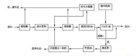 技术特点与优势: ● 投资费用低 改良型氧化沟工艺采用微孔曝气(或大功率机械曝气)与机械推流方式配合运行,可以使氧化沟设计有效水深达到 5.0米以上,占地面积大幅减小,投资费用大幅降低。 ● 运行费用低 改良型氧化沟工艺采用高效曝气方式,工艺根据进水水质地不同可调节回流污泥分配,可大幅节省设备运行费用,从而降低运行费用。 ● 运行管理方便 改良型氧化沟工艺成熟,运行稳定,常规管理方便。 CASS 工艺 CASS(Cyclic Activated S1udge System) 工艺是普通 SBR 工艺的一种改进型工艺。 CASS 反应池由预反应区和主反应区组成,预反应区控制在缺氧状态,因此,提高了对难降解有机物的去除效果提高。 CASS 进水是连续的,因此进水管道上 无电动控制阀 ,单个池子可独立运行 。 CASS 工艺可以根据脱氮除磷效果的要求,将预反应区分成厌氧、缺氧两段。在工艺运行过程中,可根据实际污泥性状和除磷要求选择回流装置的开启。 CASS 工艺处理流程简图如下: ![]()