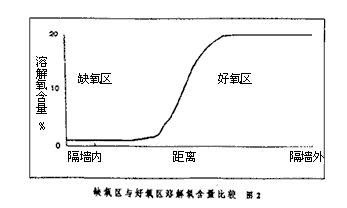 OCO工艺的一个主要特点是:好氧区与缺氧区之间的污水交换,即内回流不需泵送,以上两个区域之间有一段是相通的。两者之间的交换形式及量的大小是依靠搅拌器的控【水处理技术】制来实施,因此节省能耗。当搅拌器运转时,湍流增强,好氧区与缺氧区混合程度增强,当搅拌器停止运转时,两区之间的混合程度较低。此时测得的溶氧状况如图2所示,好氧区与缺氧区的区分很明显。OCO反应池的构造和搅拌器的循环工作可保证好氧区和缺氧区之间很高的回流比,这种频繁的变化是该工艺有效脱氮的关键之一。