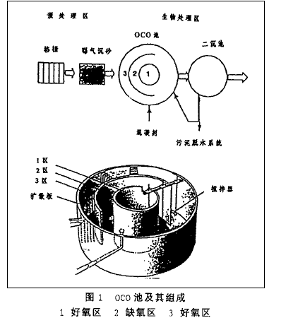 OCO-得名于生物处理装置的几何形状。OCO池呈圆形,里圈、外圈隔墙为圆形、中圈为半圆形。其工作原理如图1所示。