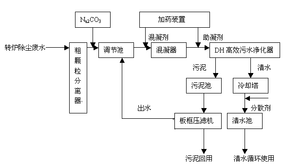 对转炉除尘废水处理的沉淀效率、水质稳定、污泥回收等几个方面的考虑,以实现稳定的水闭路循环为目的,典型工艺流程如下: