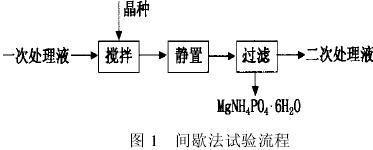 采用晶析法除磷,国内的报道很少,所用的晶种有磷灰石、炼钢转炉的炉渣等。前苏联和日本等国家也都进行过这方面的研究,尤以日本的研究比较为广泛,所用的晶种有胶状金属氧化物、浮石、活性氧化镁熔渣等。这些方法的晶种添加物均为非结晶母体,需特别处理才可以使用,且处理运行费用高,而且处理液的初始磷浓度相对较低。在该体系中,一次处理液除含有未沉淀下来的MgNH4PO4•6H2O小结晶外,还有未反应的磷及未反应的复合沉淀剂。我们在借鉴国内外晶析法的作用原理和试验结果后,提出了以除磷化学沉淀产物MgNH4PO4•6H2O作为晶种去除一次处理液中磷的方法。