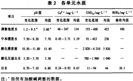 该系统调试运行10个月来,电化学部分运行正常,中和槽废水清澈透明、水质稳定;接触氧化池里曝气系统良好,生物挂膜量不大,产生的污泥较少,出水稳定。该工程于2003年5月竣工,8月顺利通过【水处理设备】验收,各处理单元的出水水质见表2。